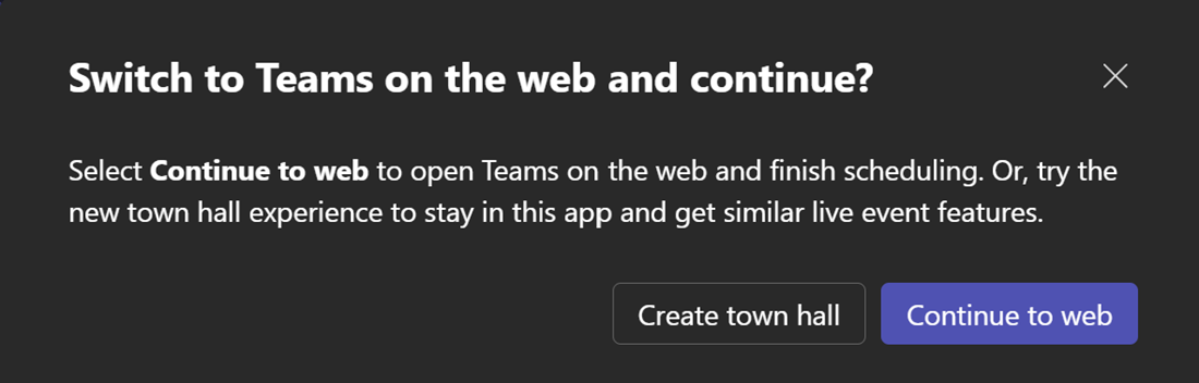 Teams live events will retire in July 2026. Events that have already been scheduled will be supported through February 28, 2027. We recommend that you upgrade to Teams town hall to take advantage of the improved experience and features for digital and hybrid events at scale. Learn more about Teams live events retirement.