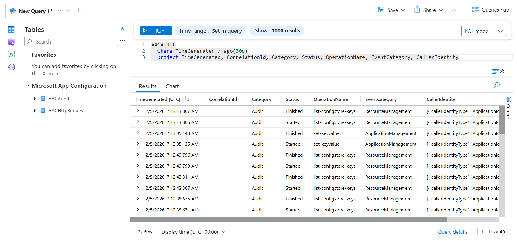 In the portal, navigate to Monitoring > Logs, and then go to the query editor. Expand Tables and select AACAudit to see the audit logs of your configuration store. Select KQL mode, enter a Kusto query into the editor, and results are displayed below.