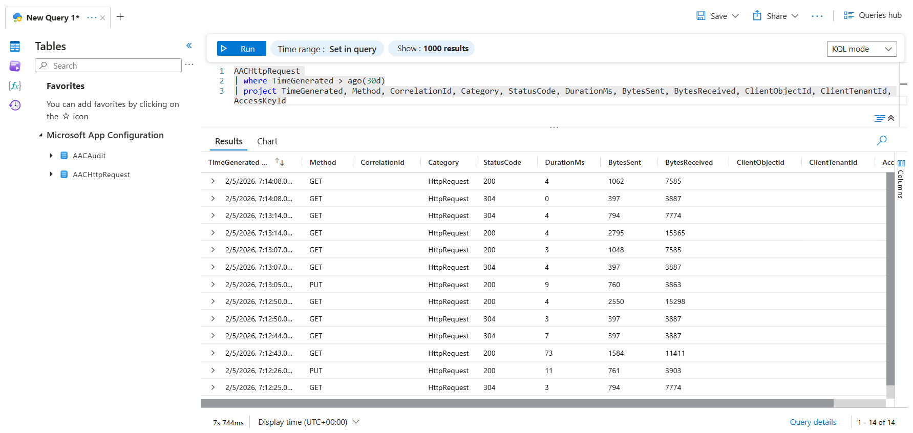 In the portal, navigate to Monitoring > Logs, and then go to the query editor. Expand Tables and select AACHttpRequest to see the HTTP request logs of your configuration store. Select KQL mode, enter a Kusto query into the editor, and results are displayed below.