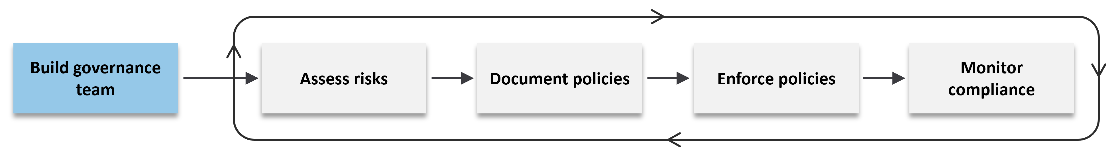 Governance process: Cloud governance is not a one-time project, but a continuous process. After initial setup, it requires ongoing monitoring, evaluation, and updates to adapt to new technologies, evolving risks, and changing requirements. After establishing the governance foundation in Step 1, Steps 2-5 repeat in a cycle to sustain and improve governance over time.