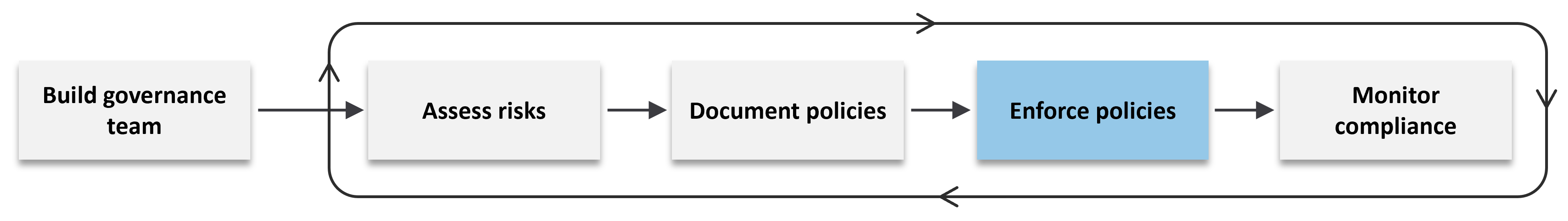 Discuss enforcement specifics. Discuss where and how you apply governance policies. The goal is to find cost-effective ways to enforce compliance that accelerates productivity. Without a discussion, you risk blocking the progress of specific teams. It's important to find a balance that supports the business objectives while managing risk effectively.