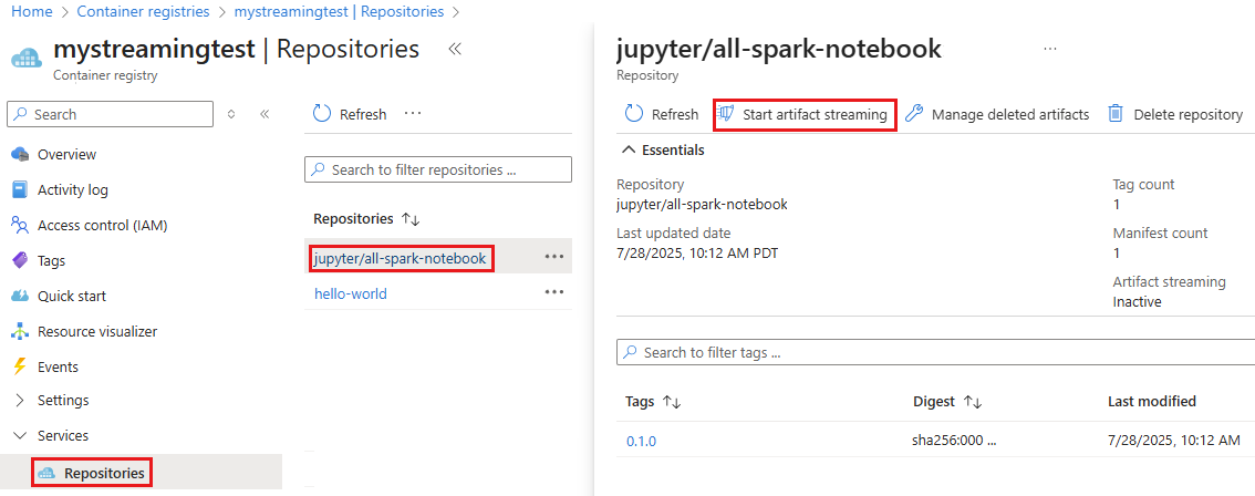 Customers with new and existing registries can start artifact streaming for specific repositories or tags. You can store both the original and the streaming artifact in the same container registry. You maintain access to the original and the streaming artifact even after turning off artifact streaming.