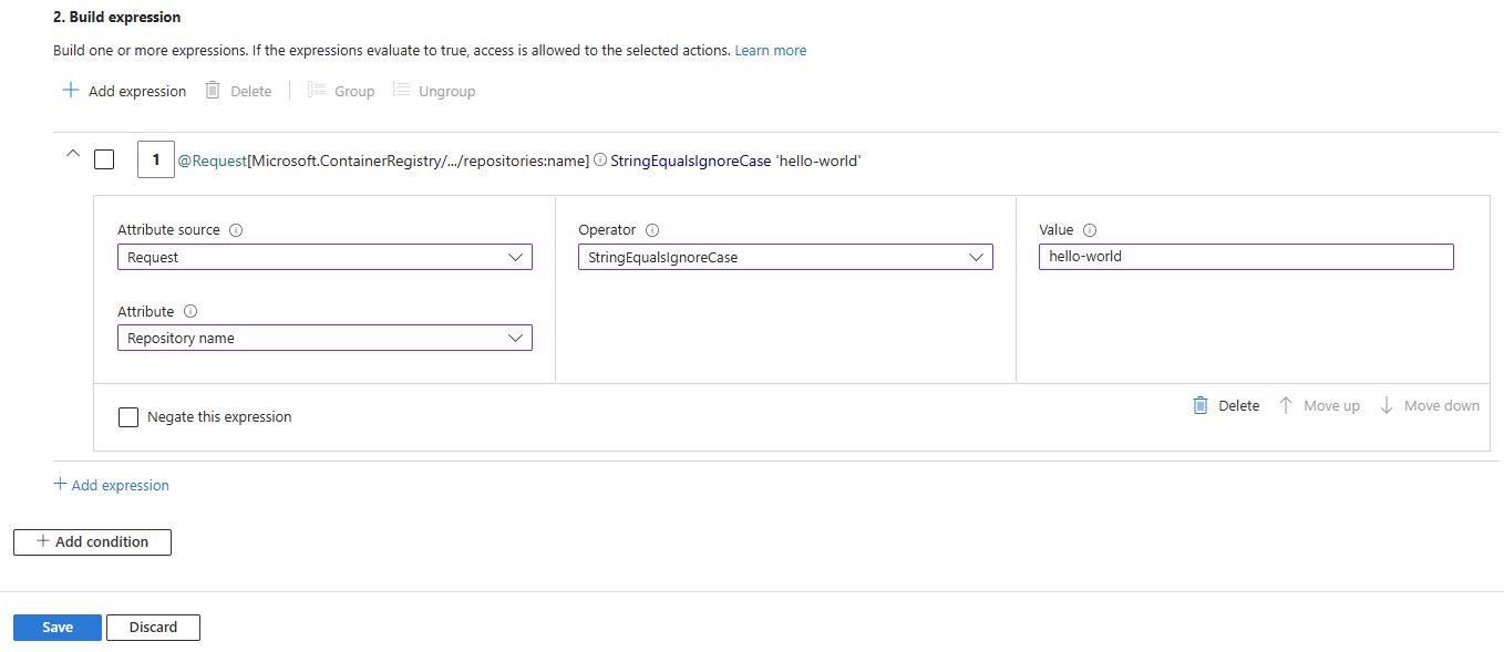 By adding ABAC conditions, this role assignment lets the identity pull images, view tags, and read metadata only from the specified repositories, preventing access to other repositories in the registry.