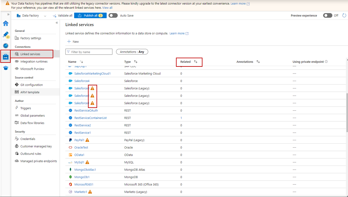 - You should see the Linked Service that is still on V1 with an alert behind it.