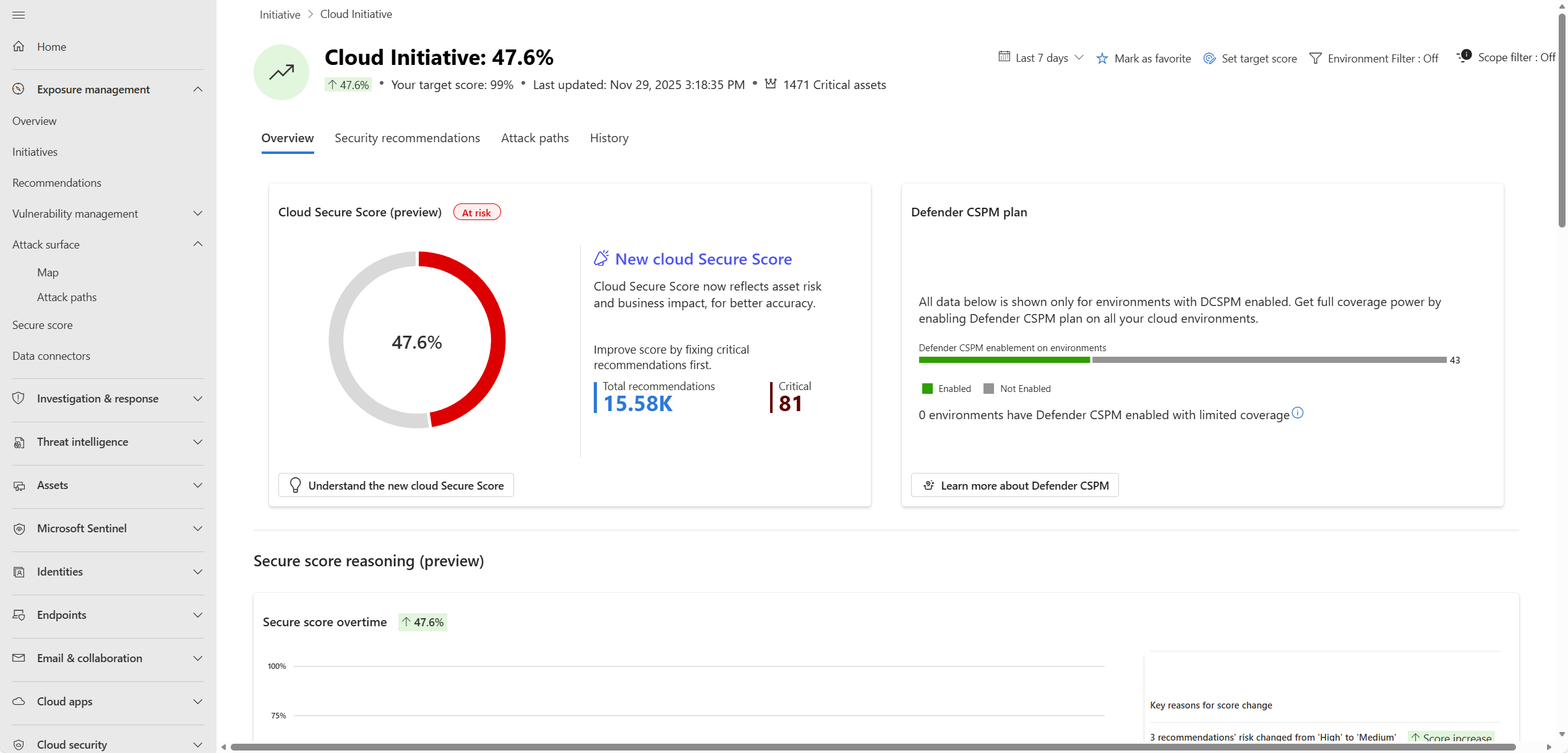 Navigate to Exposure Management > Initiatives for a consolidated cloud security posture view. This dashboard aggregates: