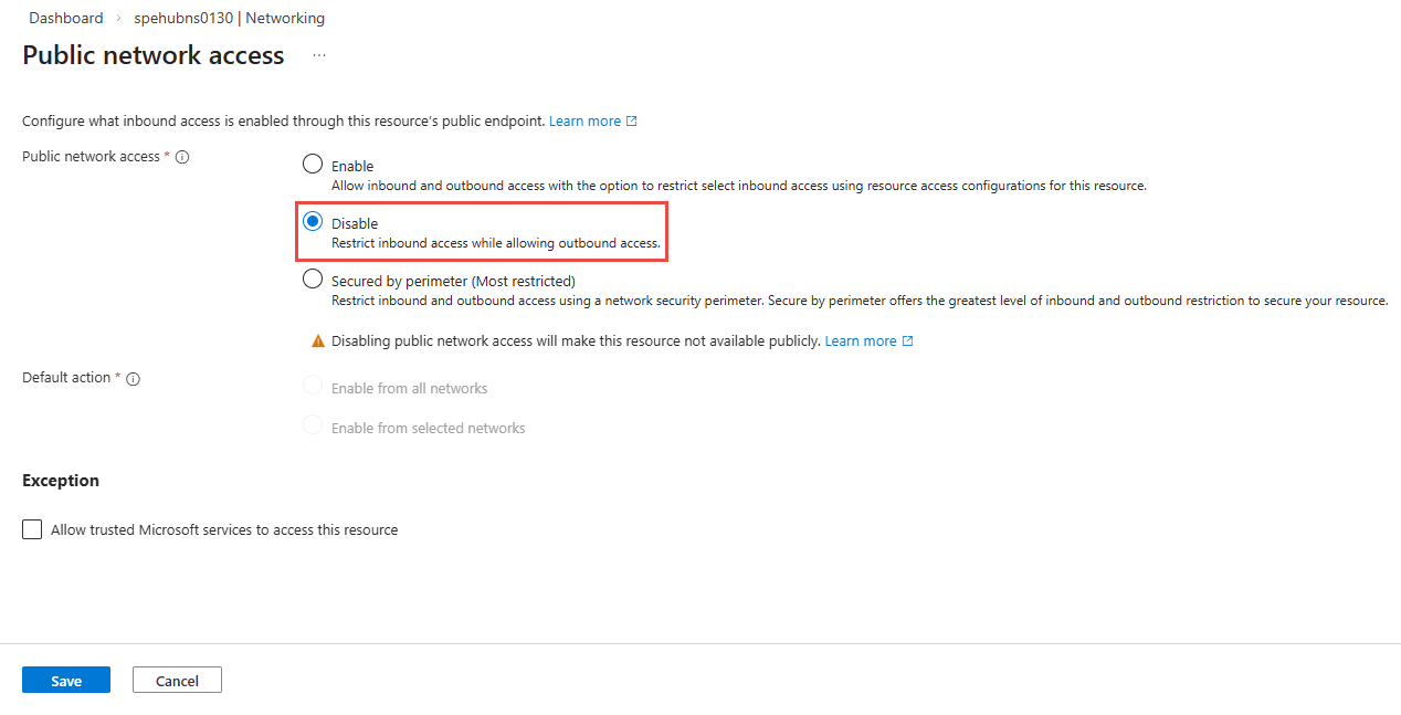 Disable public access to your Event Hubs namespace to allow access only via private endpoints.