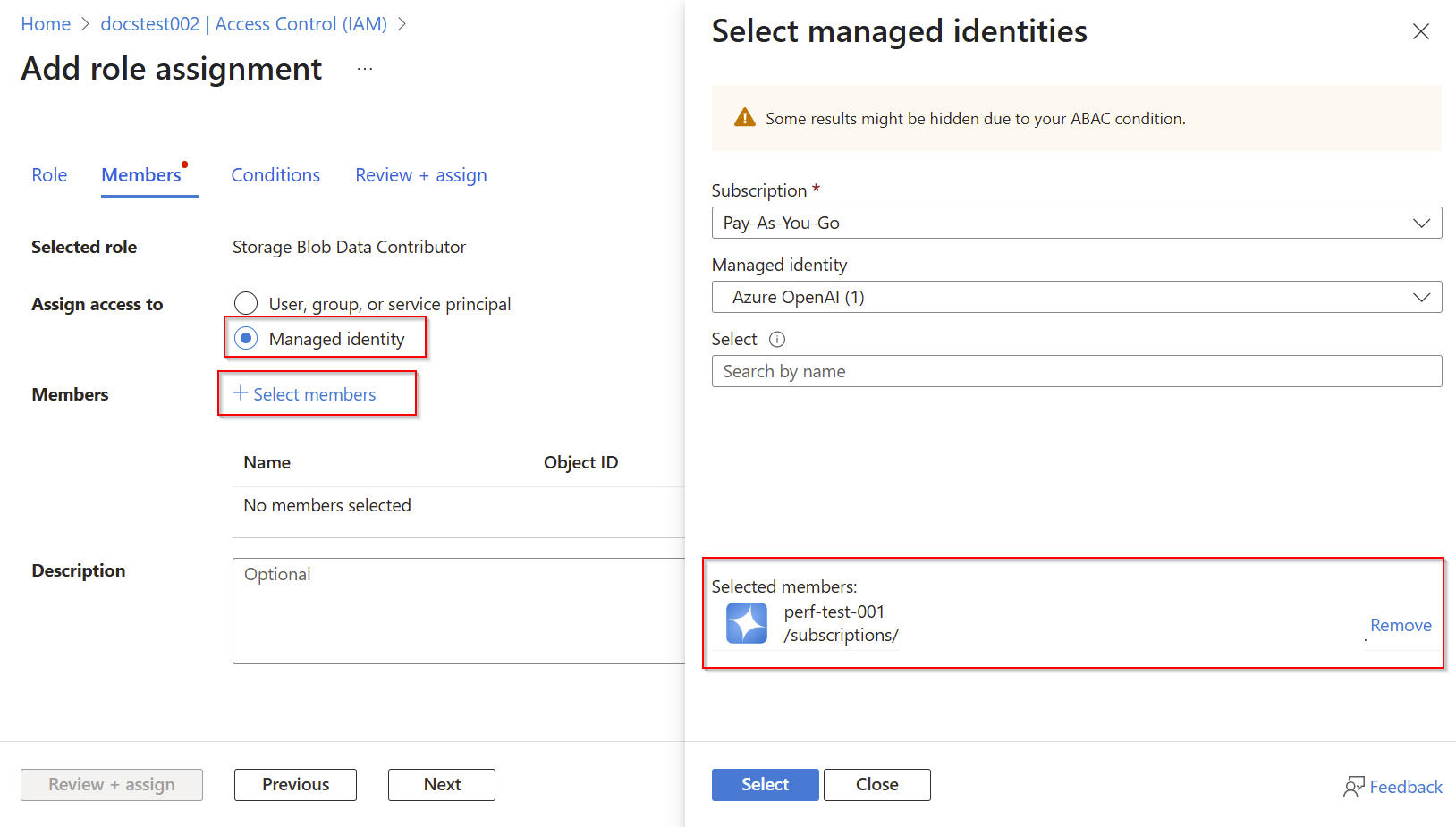Select Managed identity > +Select members > Select your Azure OpenAI resources's managed identity.