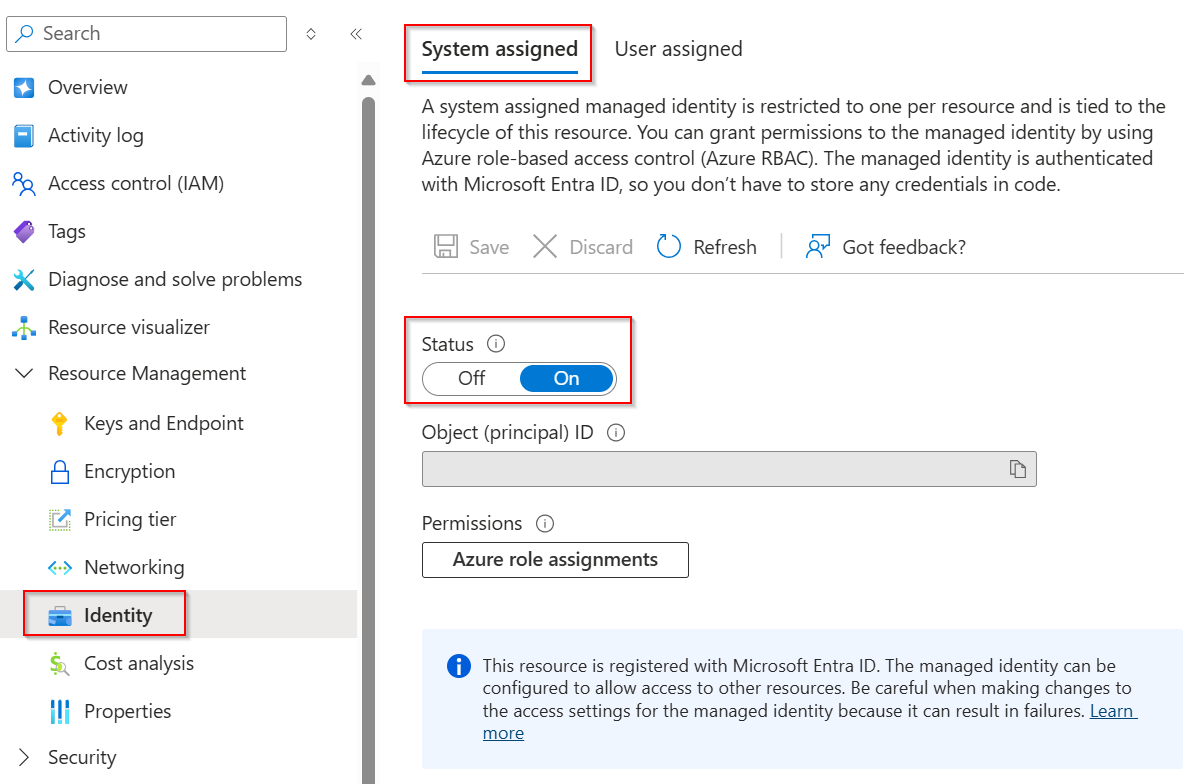 Find your Azure OpenAI resource > Select Resource Management > Identity > System assigned > set status to On.