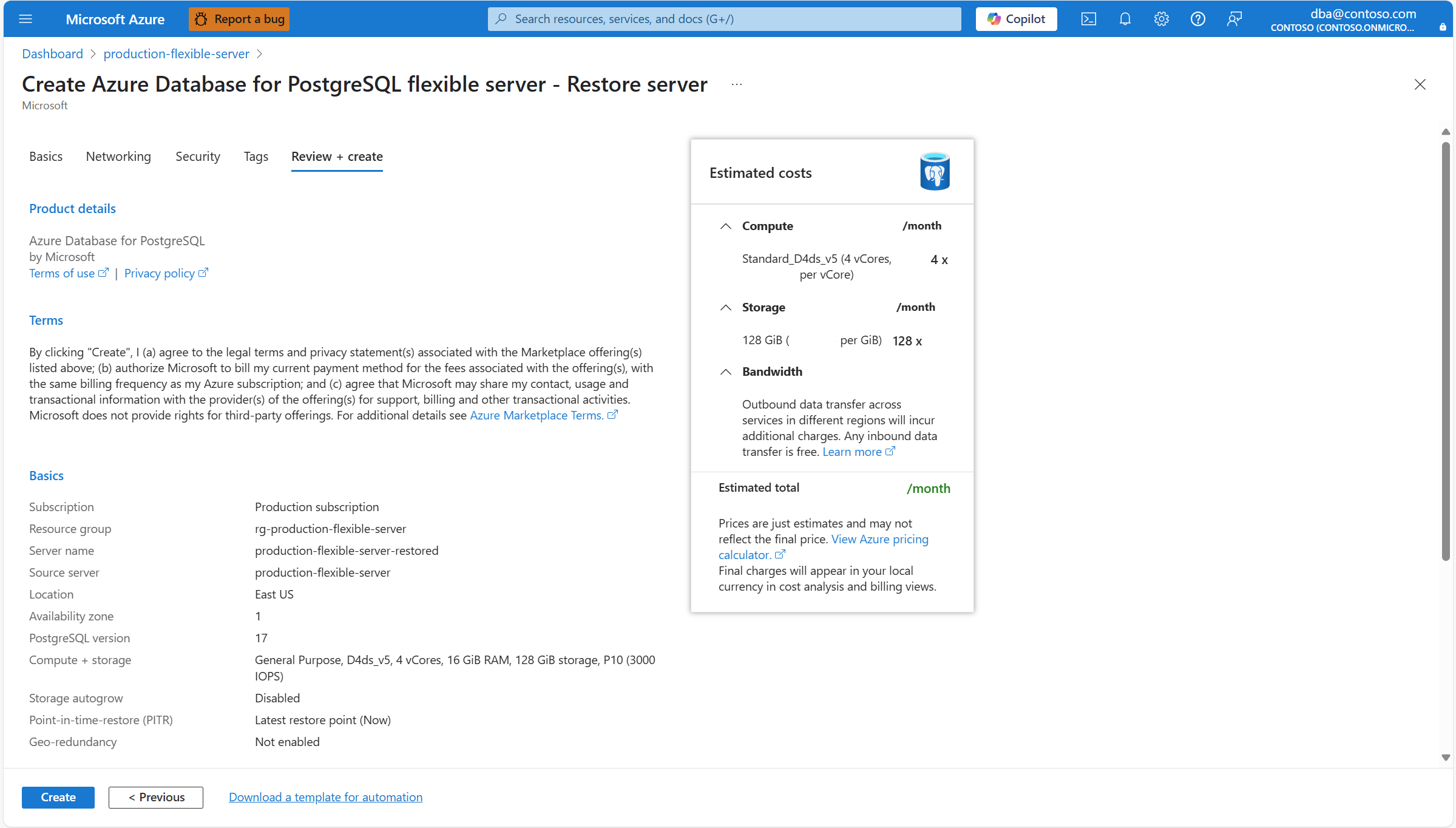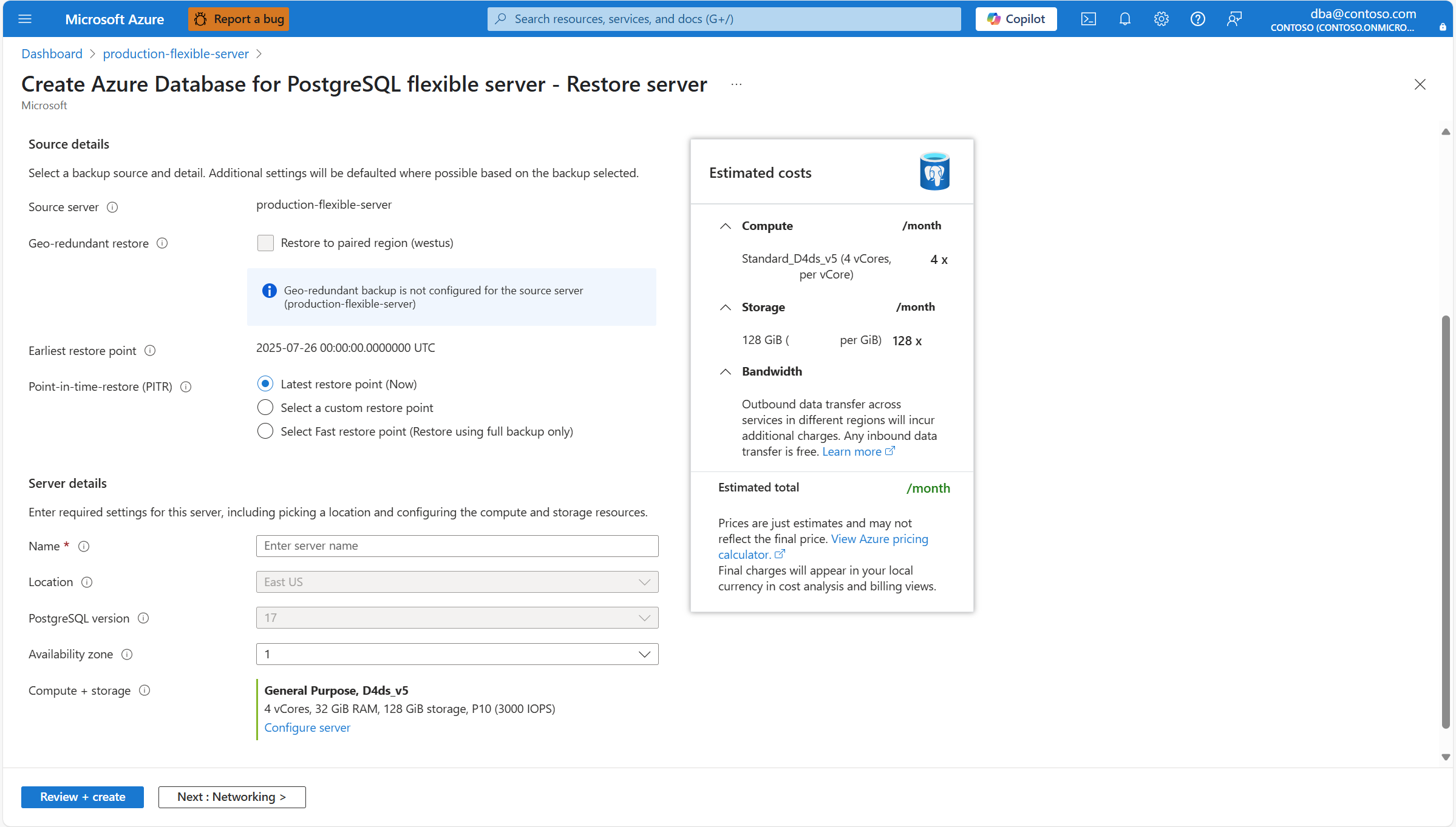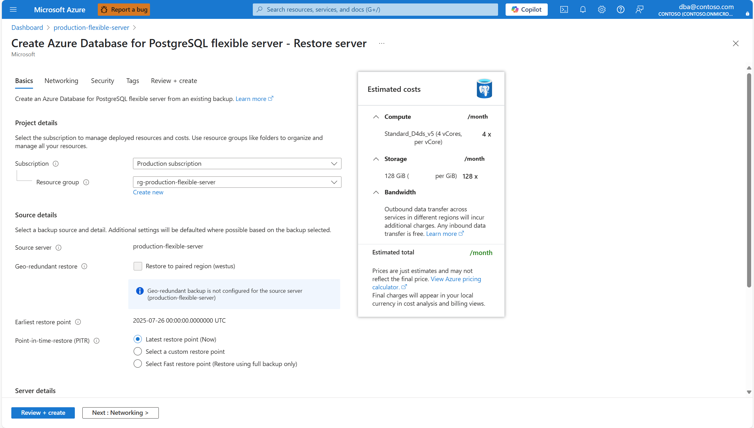 Section Setting Suggested value Description Can be changed after instance creation Project details Subscription The name of the subscription in which you want to create the resource. A subscription is an agreement with Microsoft to use one or more Microsoft cloud platforms or services, for which charges accrue based on either a per-user license fee or on cloud-based resource consumption. An existing Azure Database for PostgreSQL flexible server instance can be moved to a different subscription from the one it was originally created. For more information, see Move Azure resources to a new resource group or subscription. Resource group The resource group in the selected subscription, in which you want to create the resource. It can be an existing resource group, or you can select Create new, and provide a name in that subscription which is unique among the existing resource group names. A resource group is a container that holds related resources for an Azure solution. The resource group can include all the resources for the solution, or only those resources that you want to manage as a group. You decide how you want to allocate resources to resource groups based on what makes the most sense for your organization. Generally, add resources that share the same lifecycle to the same resource group so you can easily deploy, update, and delete them as a group An existing Azure Database for PostgreSQL flexible server instance can be moved to a different subscription from the one it was originally created. For more information, see Move Azure resources to a new resource group or subscription. Source details Source server The name of the server whose backup you want to restore on the newly deployed server. Geo-redundant restore If the source server was created with geo-redundant backups, this option would be enabled. If it's enabled, you could restore a backup kept in the storage account of the paired region to create a new server in that other region. Earliest restore point The oldest backup of the source server available to restore from. the server whose backup you want to restore on the newly deployed server. Backups are automatically deleted, based on the backup retention period configured on the source server. Point-in-time-restore (PITR) Possible options are Latest restore point (Now), Select a custom restore point, and Select Fast restore point (Restore using full backup only). To restore to latest restore point, select Latest restore point (Now). Server details Name The name that you want to assign to the newly deployed server, on top of which a backup of the source is restored. A unique name that identifies your Azure Database for PostgreSQL flexible server instance. The domain name postgres.database.azure.comis appended to the server name you provide, to conform the fully qualified host name by which you can use a Domain Naming System server to resolve the IP address of your instance.Although the server name can't be changed after server creation, you can use the point in time recovery feature, to restore the server under a different name. An alternative approach to continue using the existing server, but being able to refer to it using a different server name, would use the virtual endpoints to create a writer endpoint with the new desired name. With this approach, you could refer to the instance by its original name, or that assigned to the write virtual endpoint. Location The name of one of the regions in which the service is supported. Point in time restore only supports the deployment of the new server in the same region in which the source server exists. Compliance, data residency, pricing, proximity to your users, or availability of other services in the same region, are some of the requirements you should use when choosing the region. The service doesn't offer a feature to automatically and transparently relocate an instance to a different region. PostgreSQL version The version selected by default. Point in time restore only supports the deployment of the new server with the exact same major version used by the source server. Currently those versions are: 18, 17, 16, 15, 14, 13, 12, 11 Azure Database for PostgreSQL flexible server supports in-place upgrade, via major version upgrade. Availability zone Your preferred availability zone. You can choose in which availability zone you want your server to be deployed. Being able to choose the availability zone in which your instance is deployed, is useful to colocate it with your application. If you choose No preference, a default availability zone is automatically assigned to your instance during its creation. Although the availability zone in which an instance is deployed can't be changed after its creation, you can use the point in time recovery feature to restore the server under a different name on a different availability zone. Compute + storage Assigns the same type and size of compute and same size of storage, as the ones used by the source server at the time the backup is restored. However, if you select the Configure server link, you can change the type of storage allocated to the new server, and whether or not it should be provisioned with geo-redundant backups. After the new server is deployed, its compute options can be scaled up or down. If you want to change the type of storage assigned to the new server, or if you want to deploy it with geo-redundant backups, select Configure server: