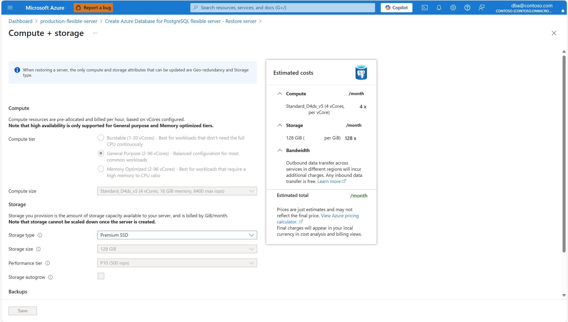 Section Setting Suggested value Description Can be changed after instance creation Compute Compute tier Can't be changed and is automatically set to the same value as the source server. Possible values are Burstable (typically used for development environments in which workloads don't need the full capacity of the CPU continuously) and General Purpose (typically used for production environments with most common workloads), and Memory Optimized (typically used for production environments running workloads that require a high memory to CPU ratio). For more information, see Compute options in Azure Database for PostgreSQL flexible server. Can be changed after the server is created. However, if you're using some functionality which is only supported on certain tiers and change the current tier to one in which the feature isn't supported, the feature stops being available or gets disabled. Compute size Can't be changed and is automatically set to the same value as the source server. Notice that the list of supported values might vary across regions, depending on the hardware available on each region. For more information, see Compute options in Azure Database for PostgreSQL flexible server. Can be changed after instance is created. Storage Storage type Select Premium SSD. Notice that the list of allowed values might vary depending on which other features you selected. For more information, see Storage options in Azure Database for PostgreSQL flexible server. Can't be changed after the instance is created. Storage size Can't be changed and is automatically set to the same value as the source server. Notice that the list of supported values might vary across regions, depending on the hardware available on each region. For more information, see Compute options in Azure Database for PostgreSQL flexible server. Can be changed after the instance is created. It can only be increased. Manual or automatic shrinking of storage isn't supported. Acceptable values depend on the type of storage assigned to the instance. Performance tier Can't be changed and is automatically set to the same value as the source server. Performance of Premium solid-state drives (SSD) is set when you create the disk, in the form of their performance tier. When setting the provisioned size of the disk, a performance tier is automatically selected. This performance tier determines the IOPS and throughput of your managed disk. For Premium SSD disks, this tier can be changed at deployment or afterwards, without changing the size of the disk, and without downtime. Changing the tier allows you to prepare for and meet higher demand without using your disk's bursting capability. It can be more cost-effective to change your performance tier rather than rely on bursting, depending on how long the extra performance is necessary. This is ideal for events that temporarily require a consistently higher level of performance. Events like holiday shopping, performance testing, or running a training environment. To handle these events, you can switch a disk to a higher performance tier without downtime, for as long as you need the extra performance. You can then return to the original tier without downtime when the extra performance is no longer necessary. Can be changed after the instance is created. Storage autogrow Can't be changed and is automatically set to the same value as the source server. Notice that this option might not be supported for some storage types, and it might not be honored for certain storage sizes. For more information, see Configure storage autogrow in an Azure Database for PostgreSQL flexible server. Can be changed after the instance is created, as long as the storage type supports this feature. Backups Backup retention period (in days) Can't be changed and is automatically set to the same value as the source server. The default backup retention period is 7 days, but you can extend the period to a maximum of 35 days. Can be changed after instance is created. Backup redundancy Automatically selected for you, based on the configuration of high availability and geo-redundancy of backups. Possible values are Locally redundant (provides at least 99.999999999% durability of backup objects over a year), Zone redundant (provides at least 99.9999999999% durability of backup objects over a year), and Geo-Redundant (provides at least 99.99999999999999% durability of backup objects over a year). When Geo-redundancy is enabled for the backup, then the backup redundancy option is set to Geo-Redundant. Otherwise, if high availability is set to Disabled or Same zone, then backup redundancy is set to Locally redundant. And if high availability is set to Zone redundant, then backup redundancy is set to Zone redundant. For more information, see Backup redundancy options in Azure Database for PostgreSQL flexible server. Can't be changed after instance is created. Geo-redundancy Leave this option disabled. Geo-redundancy in backups is only supported on instances deployed in any of the Azure paired regions. For more information, see Geo-redundant backup and restore in Azure Database for PostgreSQL flexible server Can't be changed after instance is created. Once all the new server is configured to your needs, select Review + create.