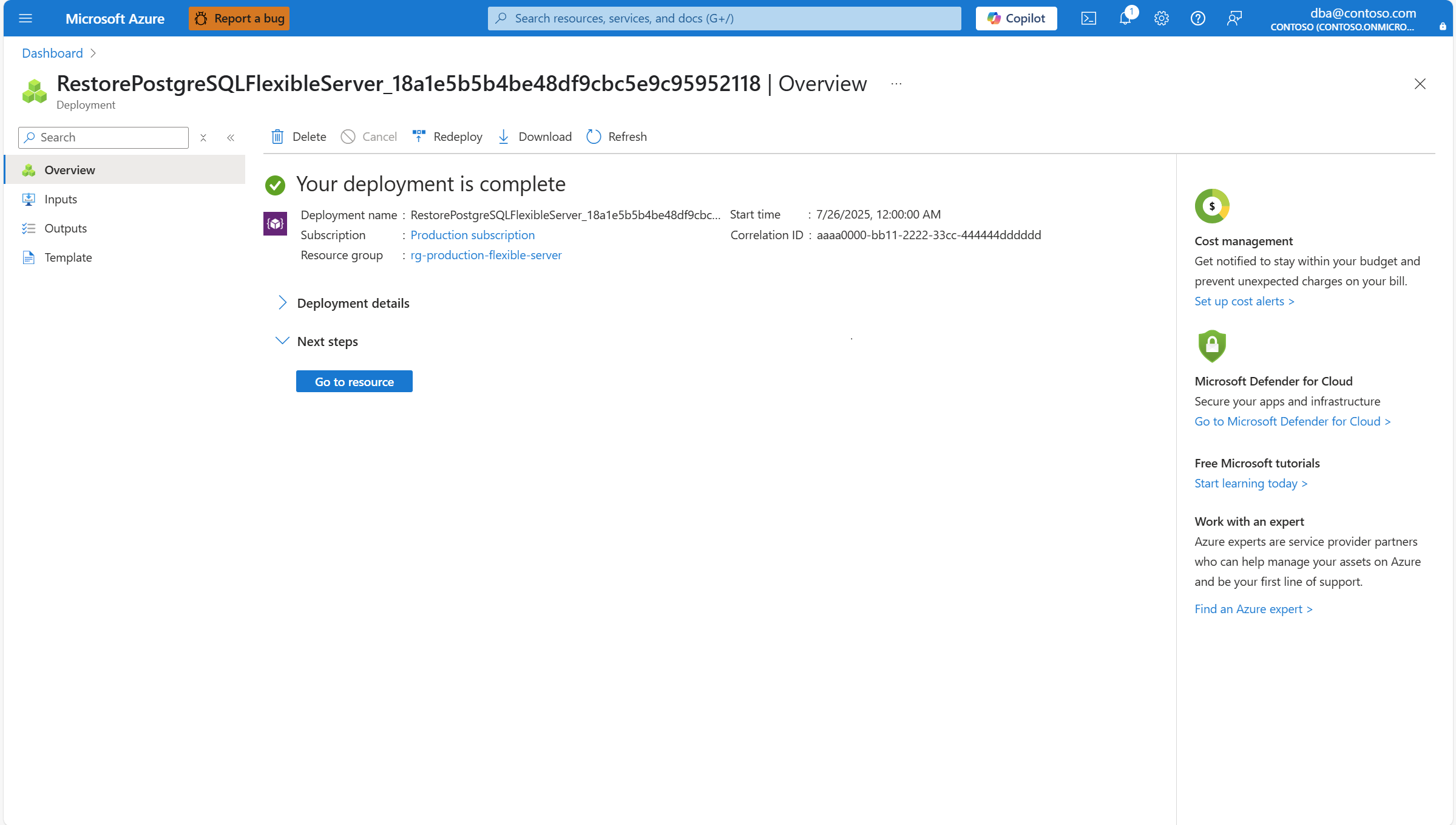 When the deployment completes, you can select Go to resource, to get you to the Overview page of your new Azure Database for PostgreSQL flexible server, and start using it: