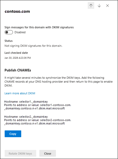 - You can rotate DKIM keys only on domains with both of the following property values on the DKIM tab of the Email authentication settings page: