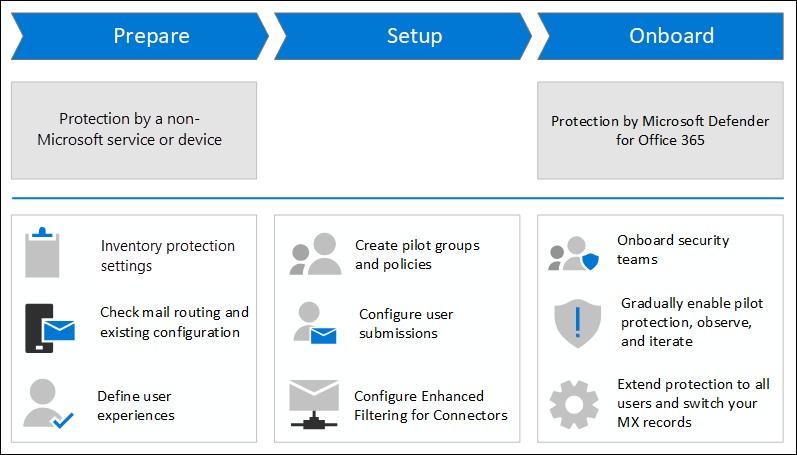 The process of migrating from a non-Microsoft protection service to Defender for Office 365 can be divided into three phases as described in the following table: