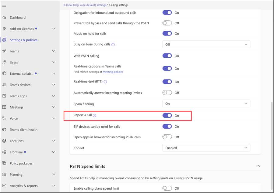 On the Calling settings page, go to the General section, find the Report a call toggle, and verify the value is