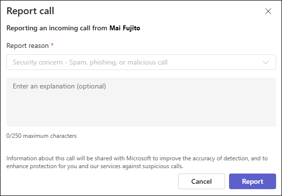 More options > Report call.In the Report call dialog that opens, verify Security concern - Spam, phishing, malicious call is selected, and then select Report.