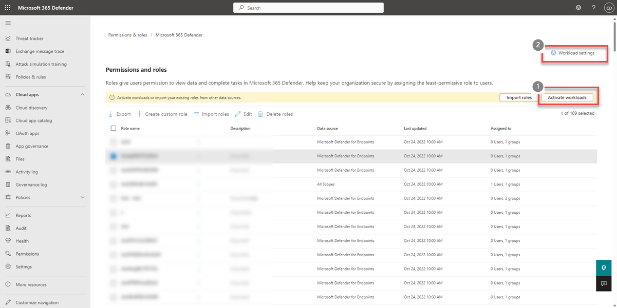 The Activate workloads button is only available when there's at least one workload that's not active for Microsoft Defender unified RBAC. Microsoft Defender for Cloud is active by default with Microsoft Defender unified RBAC. Defender unified RBAC is automatically active for Exposure Management access. Once a custom role with one of the Exposure Management permissions is created, it has an immediate impact on assigned users. There's no need to activate it.