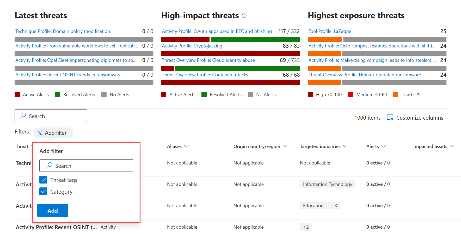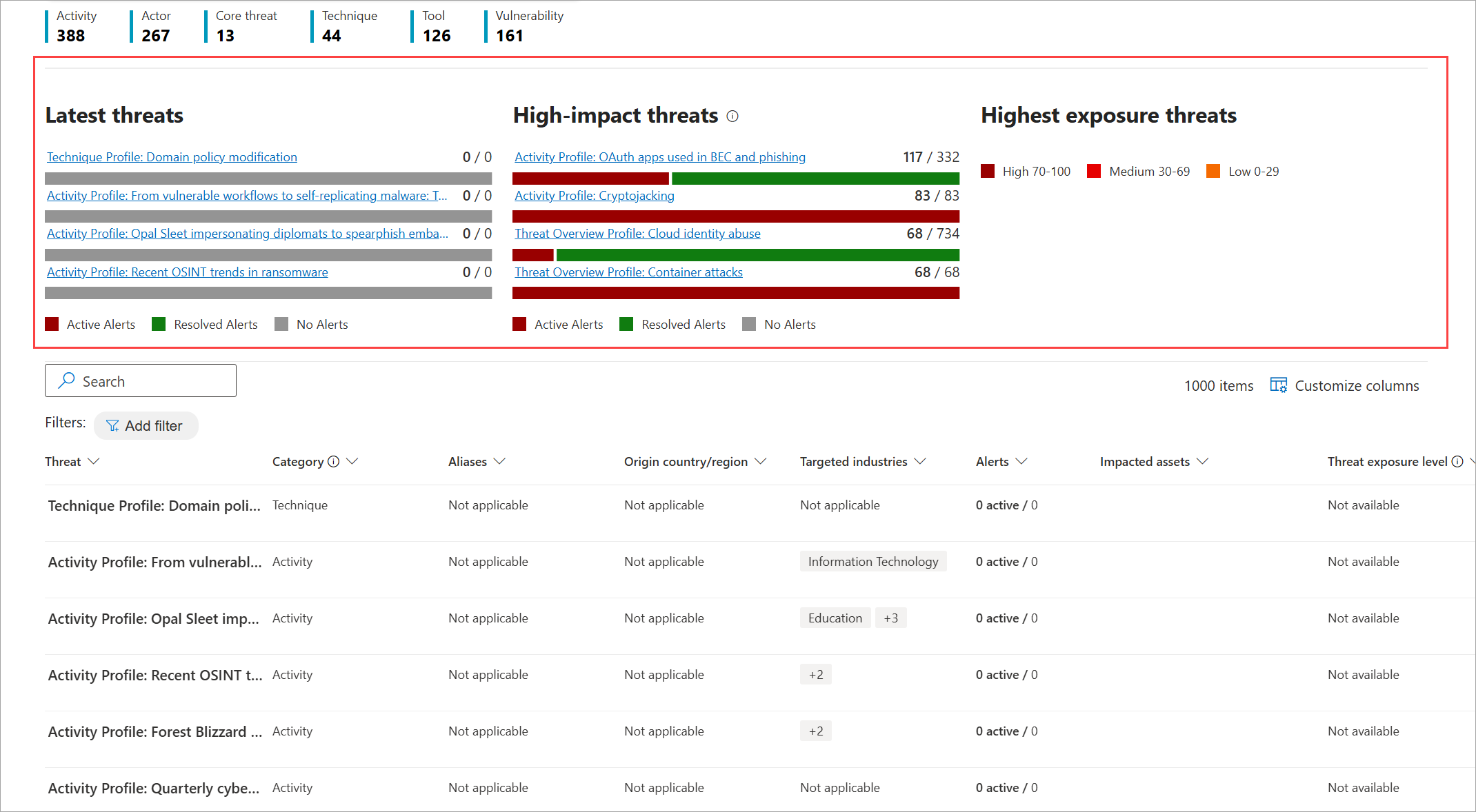 - High-impact threats—lists the threats that have the highest impact to your organization. This section lists threats with the highest number of active and resolved alerts first.