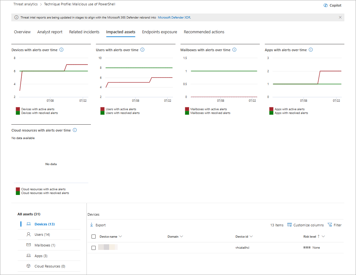 Impacted assets: Get list of impacted devices, users, mailboxes, apps, and cloud resources