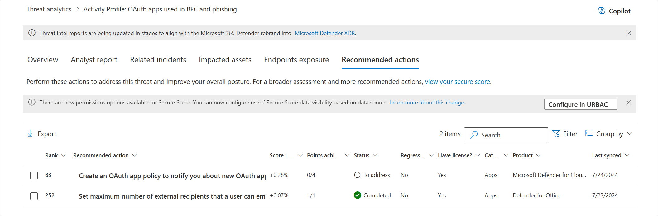 In the Recommended actions tab, review the list of specific actionable recommendations that can help you increase your organizational resilience against the threat. The list of tracked mitigations includes supported security configurations, such as: