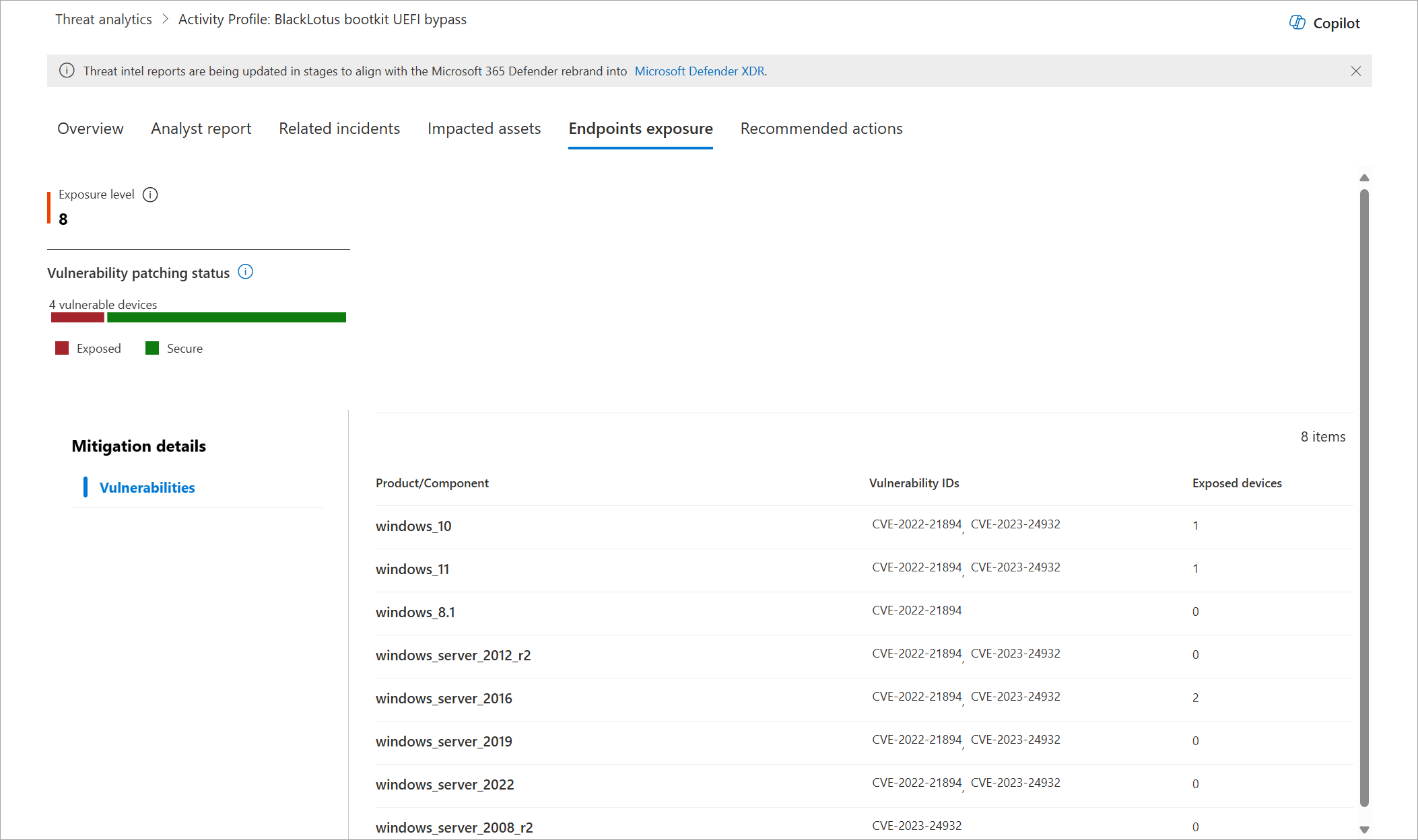 - Endpoints exposure—shows the number of vulnerable devices. Apply security updates or patches to address vulnerabilities exploited by the threat.