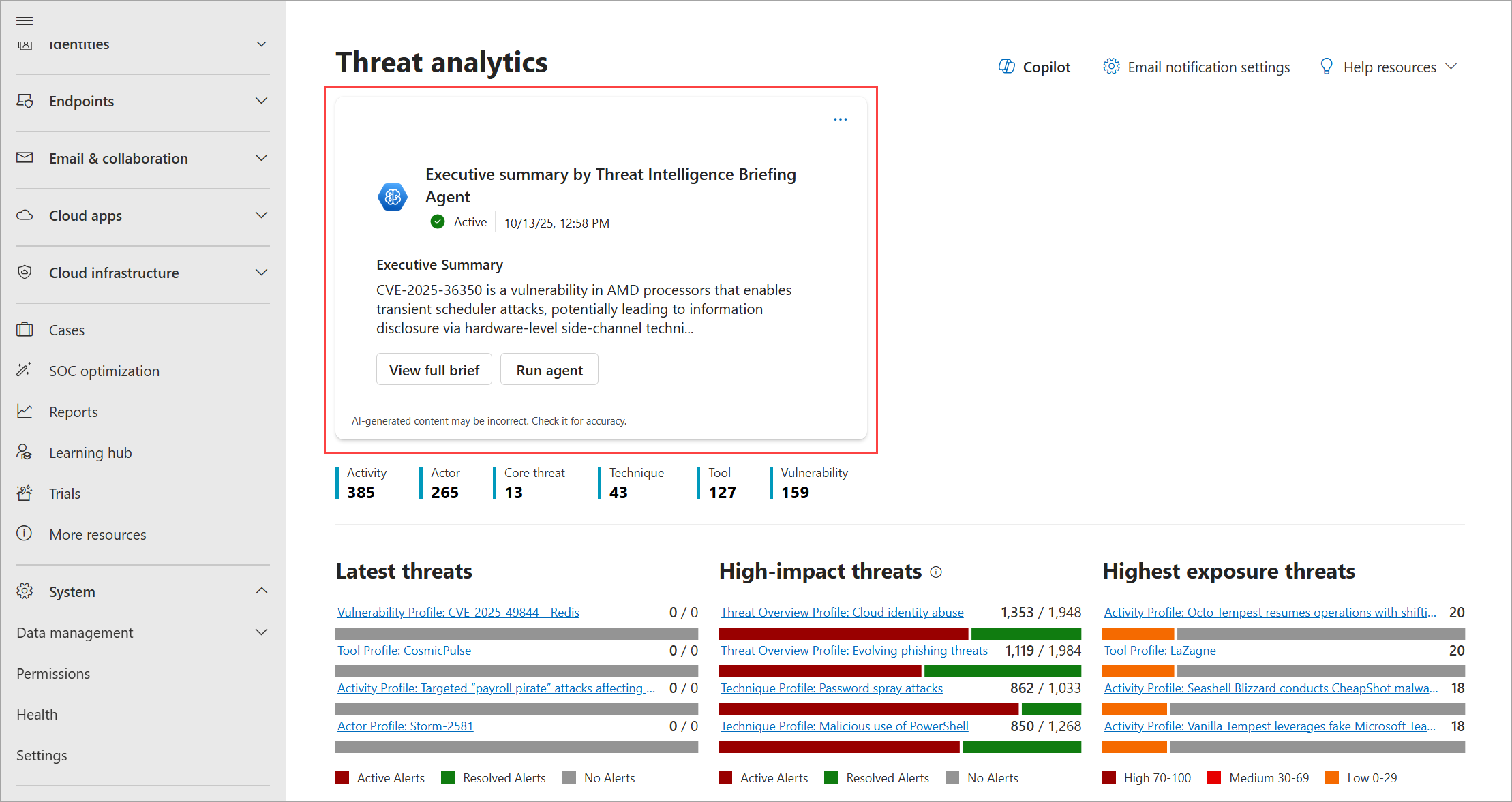 - Latest threats—lists the most recently published or updated threat reports, along with the number of active and resolved alerts.