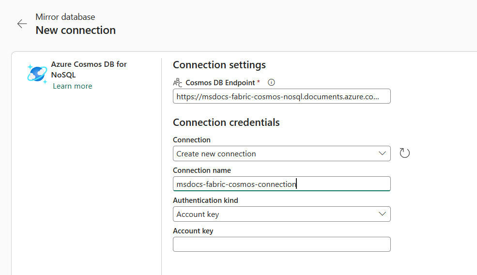 First, ensure that the source Azure Cosmos DB account is correctly configured to use with Fabric mirroring.