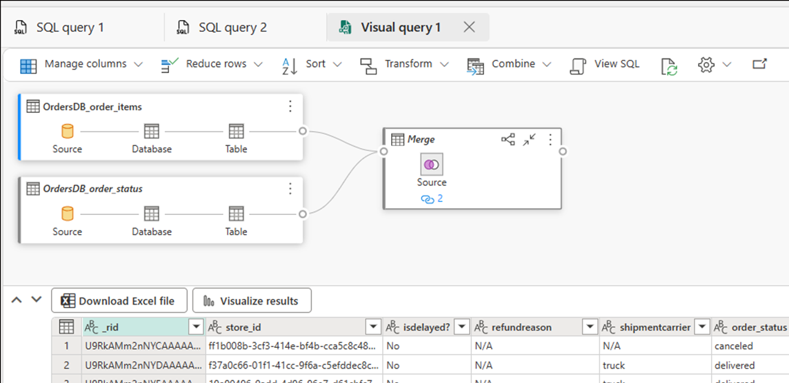 Screenshot of the query editor for both text-based and visual queries in Fabric.