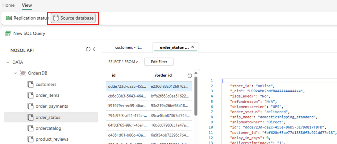 2. Select View, then Source database. This action opens the Azure Cosmos DB data explorer with a read-only view of the source database.