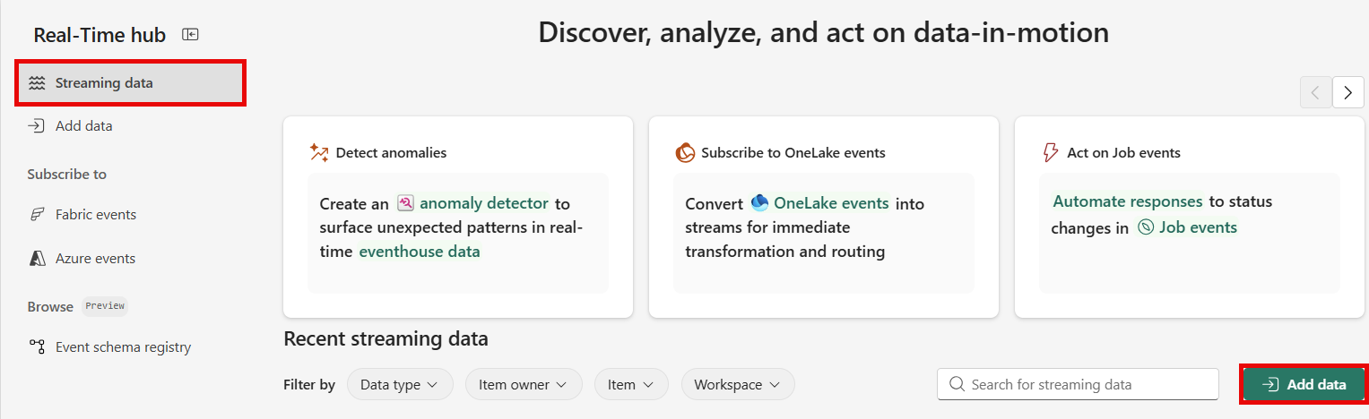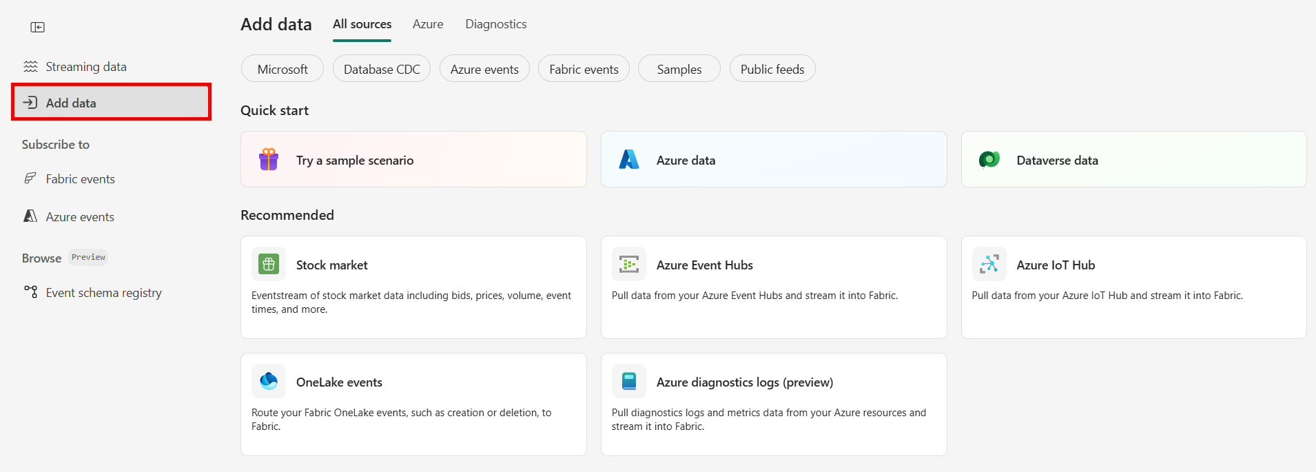 The Streaming data page opens by default. Click on the Add data button to get to the Data sources page.