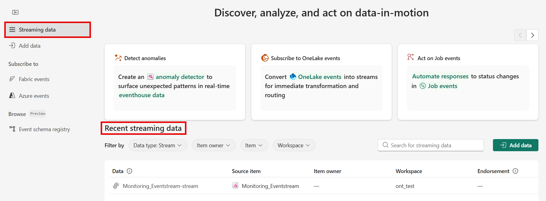 Select Real-Time hub on the left navigation menu, and confirm that you see the stream you created. Refresh the page if you don't see it.
