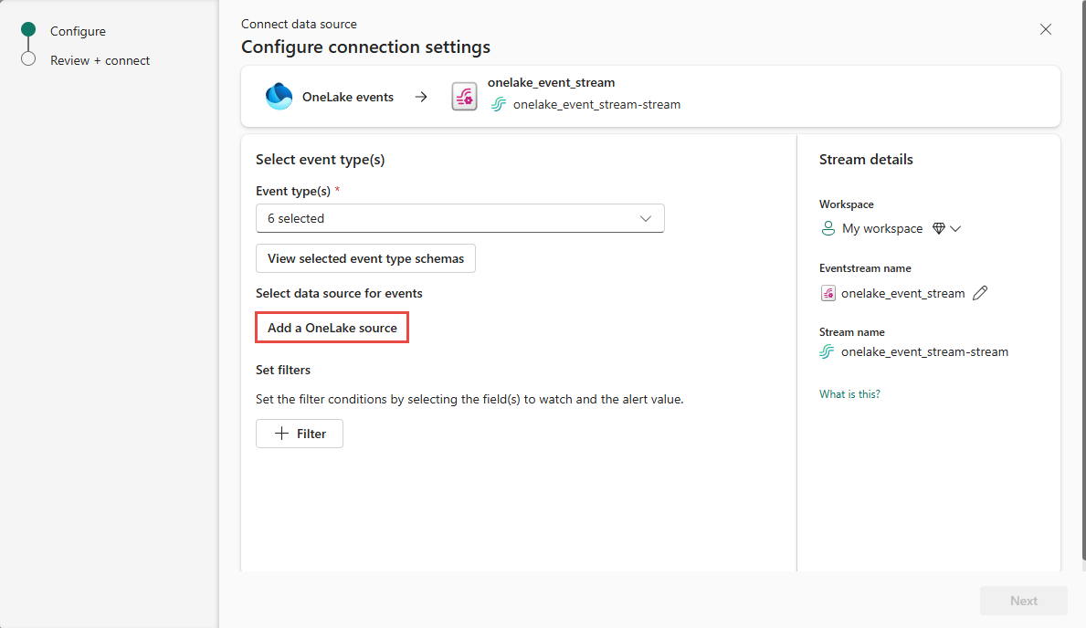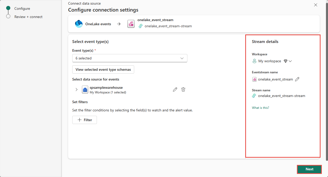 Now, use instructions from the Configure and create an eventstream section, but skip the first step of using the Add source page.