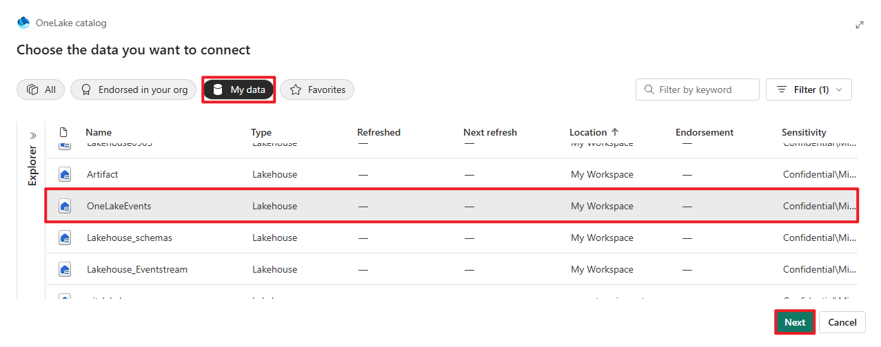 View all available data sources or only your data sources (My data) or your favorite data sources by using the category buttons at the top. You can use the Filter by keyword text box to search for a specific source. You can also use the Filter button to filter based on the type of the resource (KQL Database, Lakehouse, SQL Database, Warehouse). The following example uses the My data option.