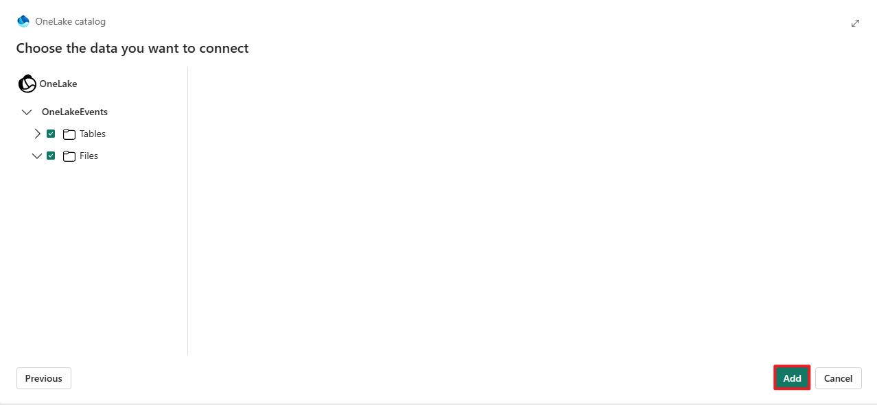 On the Data sources page, select OneLake events category at the top, and then select Connect on the OneLake events tile. You can also use the search bar to search for OneLake events.