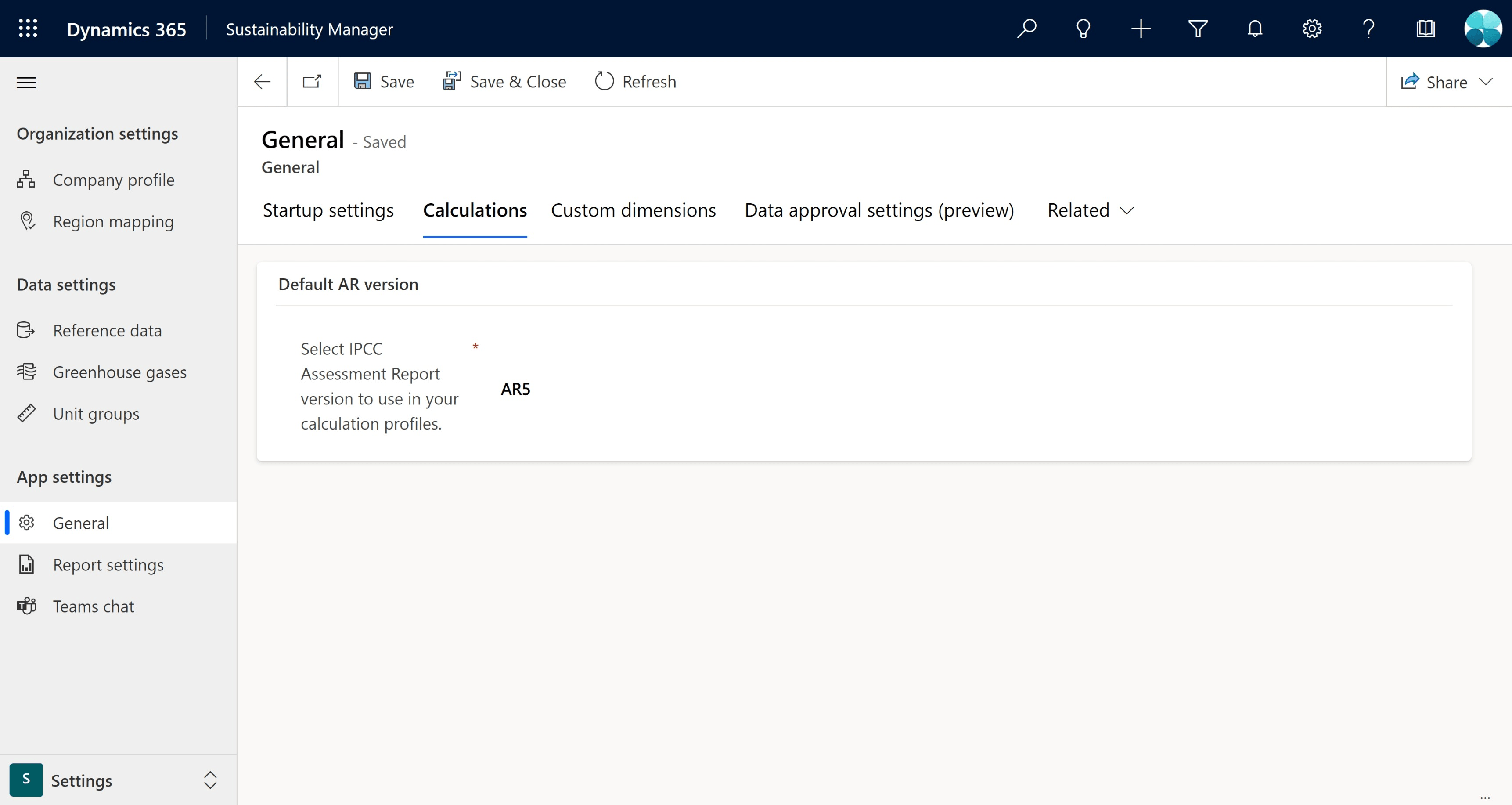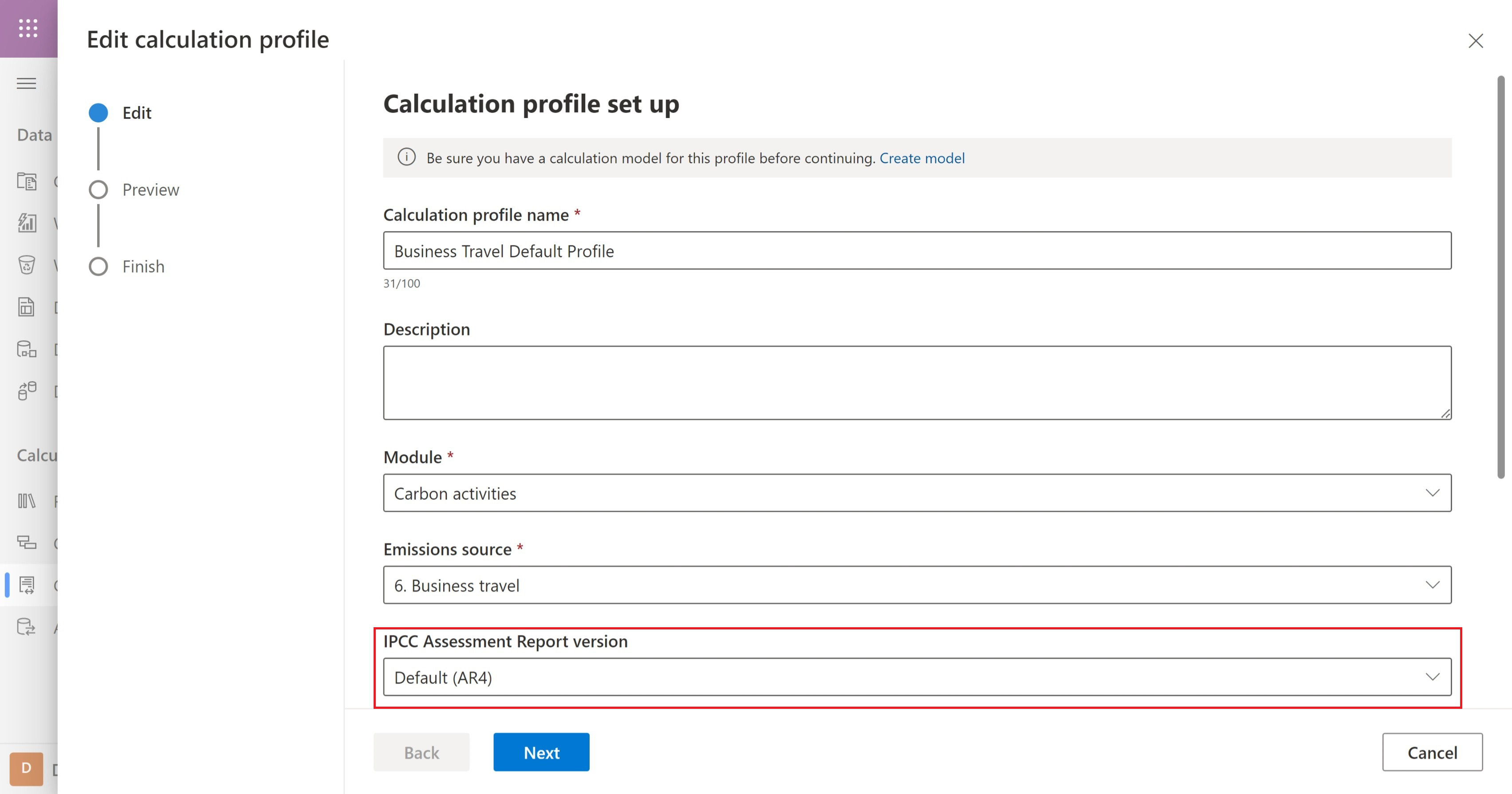 Under IPCC Assessment Report version, select the AR set you want the calculation profile to use.