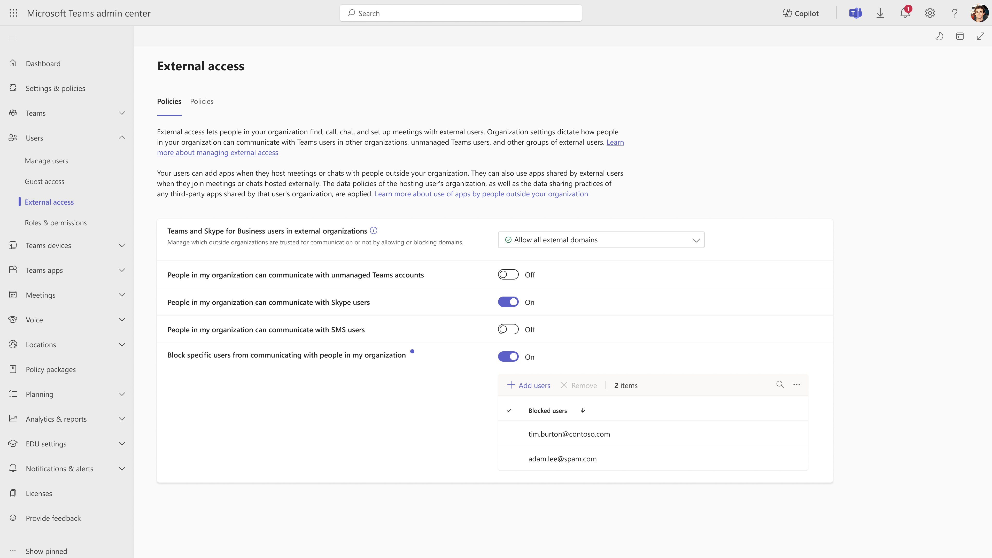 - In the Teams admin center, go to Users > External access.