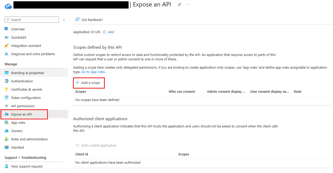 - On the overview page of the application, expand Manage, select Expose an API, and then select Add a scope.