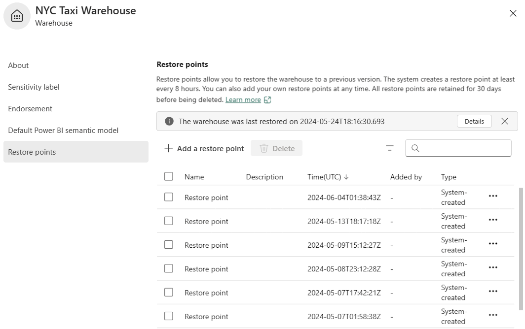 Infrastrukturresurser skapar automatiskt systemskapade återställningspunkter minst var åttonde timme. Arbetsyteadministratörer, medlemmar och deltagare kan också manuellt skapa återställningspunkter, till exempel före och efter stora ändringar som gjorts i lagret.